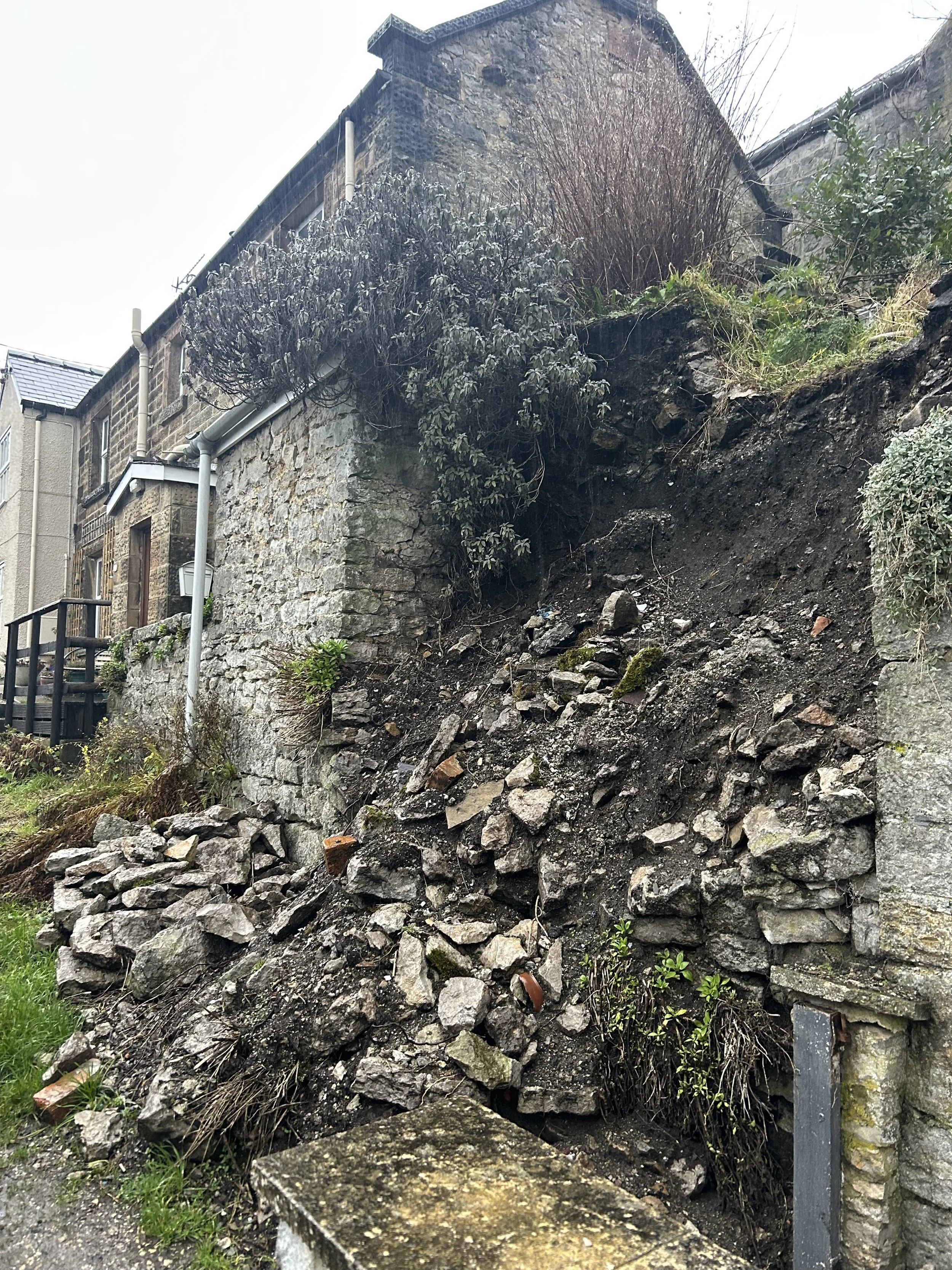 Here we built an imposing 11 foot tall carboniferous limestone retaining wall, using massive stones, some weighing in excess of 200kg. It is built to the highest structural standards, with diligently crossed joints and multiple layers of through stones. This was an emergency due to it being on the side of a public footpath and between two dwellings, so we repaired the wall immediately, preventing potential accidents and restoring safety.